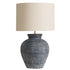 The Riverstone Lamp is large in size, boasting a textured charcoal ceramic base and natural cotton shade.
